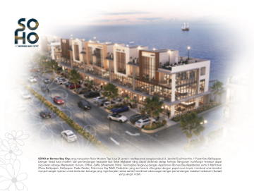 SOHO at Borneo Bay City yang merupakan Ruko Modern Tepi Laut (3 Lantai + rooftop area) yang berada di Jl. Jendral Sudirman No. 1 Pusat Kota Balikpapan. Dengan fasad kaca modern dan pemandangan exclusive laut Selat Makassar yang dapat dinikmati setiap harinya. Bangunan multifungsi tersebut dapat digunakan sebagai Restaurant, Hunian, Office, Caffe, Showroom, Hotel. Terintegrasi langsung dengan Apartemen Borneo Bay Residences, serta 3 Mall besar (Plaza Balikpapan, Balikpapan Trade Center, Podomoro Bay Mall). Pedestrian yang asri karena dilengkapi dengan pepohonan tropis, membuat area tersebut menjadi sangat nyaman untuk Anda dan keluarga yang ingin berjalan santai sambil menikmati udara segar dengan pemandangan matahari terbenam (Sunset) yang sangat indah.